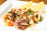 Grilled calamari in a lemon garlic white wine sauce with cherry tomatoes.